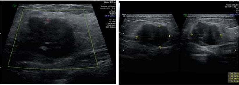 A 29-year-old woman, who had lumpectomy in 2016 which was found to be benign, visited for preconception counseling. Unfortunately, she had not retained the medical notes and discharge summary of that surgery. She again presented with a lump in the same breast and was recommended to have an ultrasound which showed BIRADS 4–5 suspicious of malignancy (Figure 1). Mammography picked up a 3 × 2.3 cm mass in upper-inner quadrant (UIQ) of left breast with left axillary lymphadenopathy. She was referred to a breast oncologic surgeon who recommended a biopsy. The mass was diagnosed as invasive ductal carcinoma (IDC) grade 3, ki-67>25% and a positron emission tomography (PET) scan was recommended. During this period, she missed her periods and tested positive for pregnancy and hence PET scan was deferred. She was offered termination, but she declined. She underwent left breast conservation surgery with axillary sampling and clearance. She was diagnosed as stage IDC III p T2N2Mo, HPR T 3 cm IDC IIILVI +9/22 nodes positive. The patient underwent chemotherapy with Doxorubicin and Cyclophosphamide from second trimester three weekly for 4 cycles. Her anomaly scan was normal, but she had complete placenta previa due to which she had repeated episodes of bleeding per vaginum. This required multiple admissions to the hospital to try and prolong the pregnancy. Her antenatal growth scans were done regularly to assess the growth of fetus and look for any lesions (metastasis) in liver.
