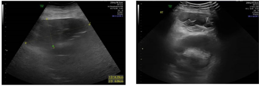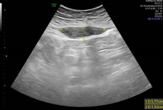 During the cesarean delivery, after dissecting the subcutaneous tissues, the abdominal fascia was found to be unusually weak and could be easily dissected with blunt fingers. Beneath the fascia, a significant amount of blood clots was discovered, while the right rectus muscle appeared dark purple-black with clot-adherent areas (Figure 1). No major source of bleeding was identified. After delivering the fetus and closing the uterus, a review of the abdominal cavity revealed no other hematomas. Due to the absence of active bleeding and the hemodynamically stable condition of the patient, a decision was made to leave the blood-infiltrated right rectus muscle and adherent clots in place and proceed with the standard closure of the abdominal wall layers. To minimize the risk of hematoma infection, the patient received prophylactic antibiotics (amoxicillin) for 48 hours. Given the increased postpartum risk for VTE (due to parity, maternal age, and surgery) and the presence of increased bleeding risk, pneumatic stockings were used during the postpartum hospitalization instead of LMW heparin. The patient’s postoperative course was unremarkable, with stable vital signs, no fever, minimal pain requiring minimal medication, free ambulation, and stable blood test and imaging results. She was discharged home on postoperative day 3 in good condition, per standard protocol. A follow-up ultrasound at the day of discharge, one month and three months postoperatively revealed a smaller hematoma (Figure 2, Figure 3, Figure 4). Throughout the puerperium period, she experienced no fever or hospital readmission.
