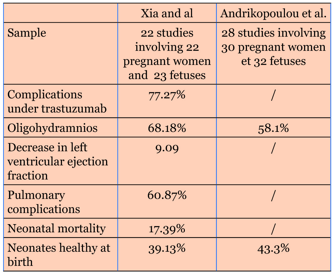 Despite 19 overlapping studies, the findings from both meta-analyses strongly support the association between trastuzumab exposure and fetal complications, including reduced amniotic fluid, renal/pulmonary dysfunction, and reversible maternal cardiotoxicity [11],[12].