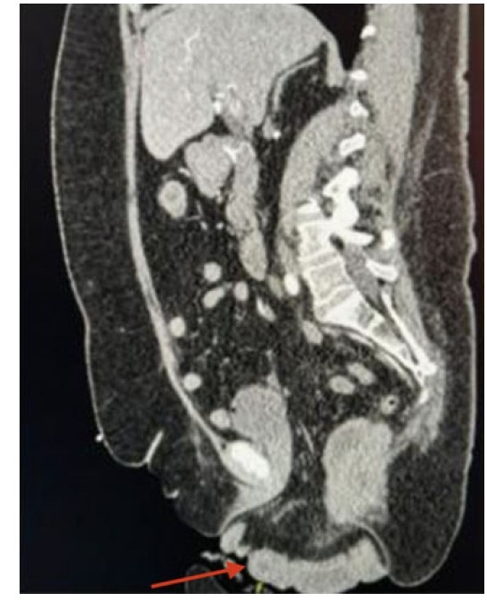 On examination, the patient appeared uncomfortable. The eviscerated bowel appeared strangulated/ischemic (Figure 1). The patient remained hemodynamically stable. Computed tomography (CT) showed evidence of pelvic floor prolapse with peritoneal fat and nondilated loops of small bowel and rectosigmoid colon extending through the vagina (Figure 2).