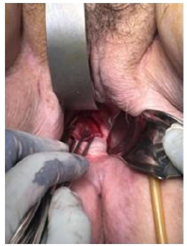 The patient was taken to the operating room for emergent laparotomy by the gynecology and general surgery team. The time interval from emergency room presentation to the operating room was about 2 hours. After reduction of eviscerated bowel, a midline vertical incision was made, and the entire small bowel was inspected. As already known from preoperative examination, the eviscerated bowel was noted to be strangulated, which required small bowel resection followed by anastomosis. Due to the patient’s body habitus and short vaginal canal, it was not possible to repair the defect adequately through a transabdominal approach. Attention was then directed to the vaginal cuff transvaginally and was noted to be 5 cm in length (Figure 3). Vaginal cuff was repaired with 5 interrupted sutures using absorbable suture, 1-0 polyglactin 910 (Vicryl). Peritonealization was not performed and there was no indication for drain placement. There were no intraoperative complications. The patient received postoperative antibiotics with Pipercillin and Tazobactam.