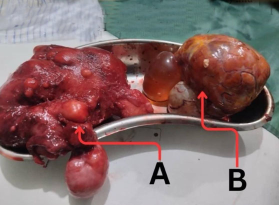 Ultrasonography revealed a fairly large, multiloculated, multiseptated, mixed echogenic mass extending from the left adnexium through the pouch of Douglas to the right, measuring 8.9 × 11.7 cm with a volume of 414 cm³. Irregularly shaped, nodular soft tissue masses were seen within the cystic mass (Figure 1). The uterus was stretched upward by the low-lying echogenic mass with an enlarged upper half having an expanded fundal end with generalised interstitial leiomyoma changes. The endometrial stripe was well appreciated, 2 mm thick, lying more posteriorly.