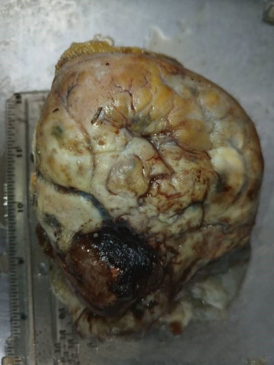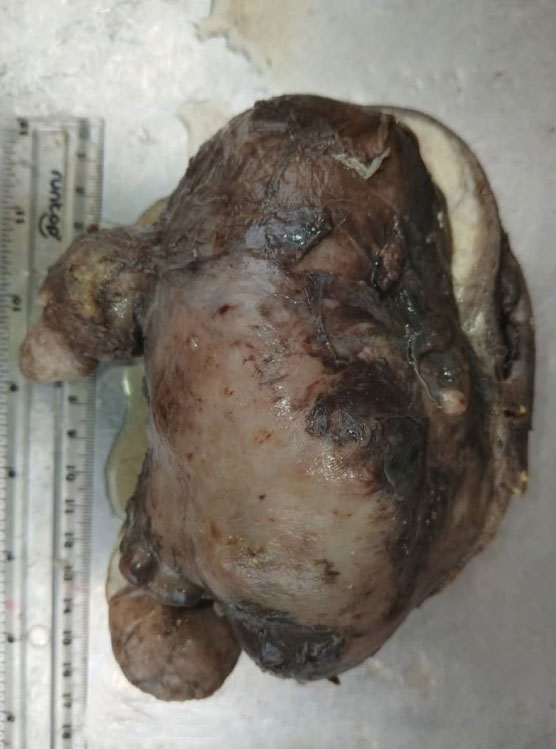 A 70-year-old Para 2+0 retiree presented in our facility with vaginal bleeding of three months duration. The bleeding was intermittent, initially slight, but later increased to moderate to heavy. This was associated with abdominal distension, which had also increased, but there was no history of post-coital bleeding, hormone replacement therapy, or symptoms of thyroid dysfunction. She was 20 years postmenopausal and had undergone myomectomy 30 years earlier with an uncomplicated postoperative period. She was a known asthmatic and hypertensive and was compliant with her antihypertensives. Her last childbirth, a full-term normal vaginal delivery, occurred 37 years before presentation.