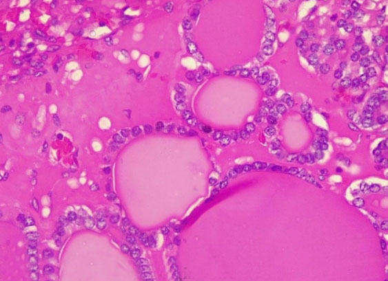 Histology of the left ovary revealed thyroid follicles, cholesterol clefts, and focal areas of multifollicular proliferation with follicular cells exhibiting vesicular nuclei and no features of malignancy, confirming a benign germ cell tumor, specifically SO (Figure 5).