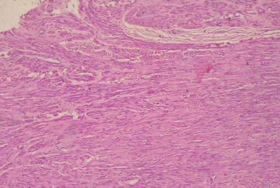 Histology sections of the myometrium and the intramural nodules revealed benign mesenchymal neoplasms composed of proliferating mature smooth muscle cells disposed in a criss-cross pattern within a fibrocollagenous stroma. The tumor cells possessed plump, spindle-shaped, bland nuclei and abundant cytoplasm with no evidence of malignancy (Leiomyomata) (Figure 6). That of the endometrium showed numerous cystically dilated glands lined by hyperplastic columnar epithelia, admixed with fibrocellular stroma with no evidence of atypia or malignancy (simple endometrial hyperplasia without atypia). There was also no evidence of malignancy in the histologic sections of the cervix, the cytology of the ascitic fluid was negative for malignant cells, and nodal status was also negative.