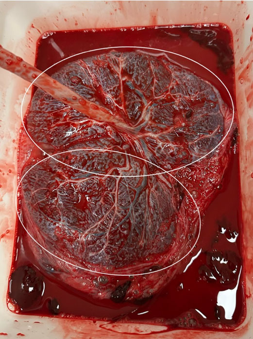 Postpartum evaluation revealed unremarkable infectious or chromosomal anomalies. Though not routinely done, coagulation studies were ordered due to the unexplained etiology of the late IUFD and early VTS. Studies do show that third-trimester IUFD is significantly associated with thrombophilia [2]. The coagulation studies for this patient revealed low PT at 9.4 seconds (ref: 10–13 seconds), INR at 0.8 seconds (ref: 0.9–1.1 seconds), as well as low protein S activity at 43% (ref: 60–140%). Genetic thrombophilia testing identified heterozygosity for the MTHFR C677T mutation. Physical examination of the placenta noted grossly abnormal architecture with two separate identifiable lobes (Figure 1), but there was no histopathologic evidence of infarction, thrombi, or inflammatory infiltrates.